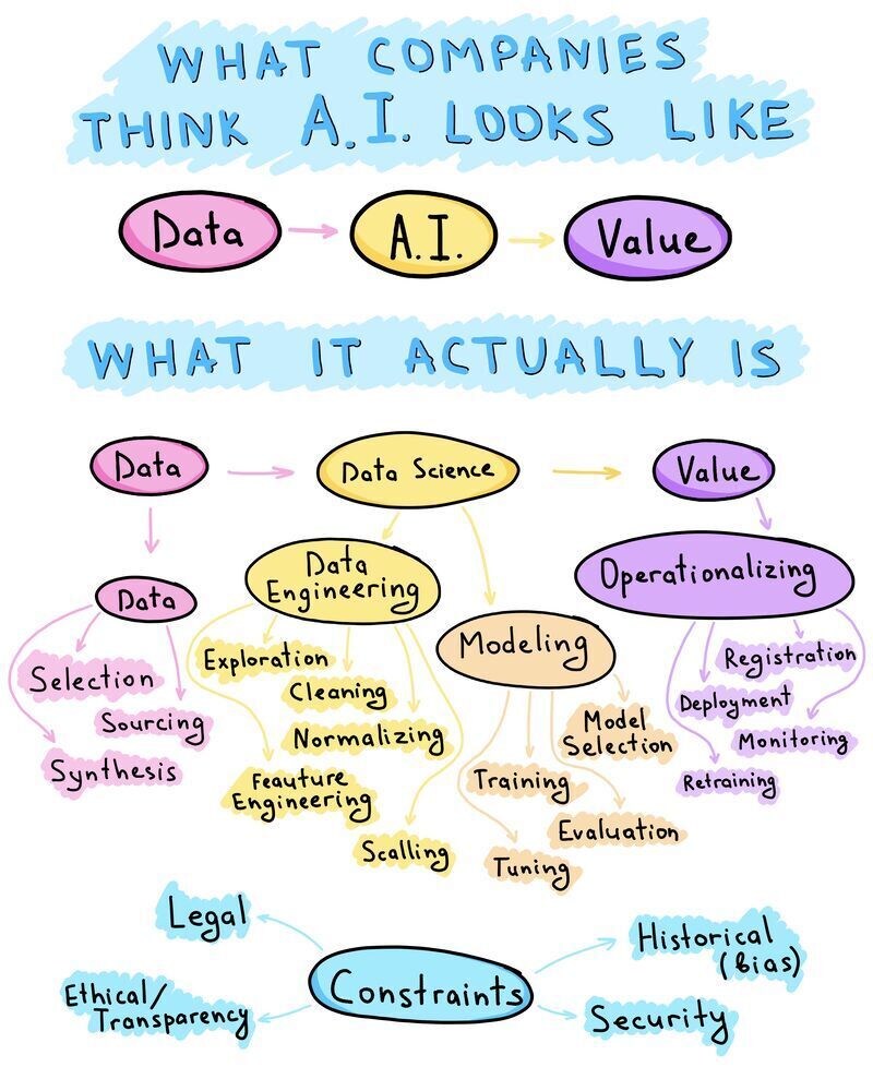 BONUS : Here is a very insightful revelation of how an AI data project looks like in action ! Given that the pursuit if getting more value from Data, often people think AI is single switch that can do the magic, where it is the combination of Data engineering (Data engineers ) , Machine learning (Data Scientists) and Operationalising it (Cloud Ops) by effectively handling all the Security, Legal, Regulatory and Ethical issues if any. Often the backend work of clearing the constraints ( i.e the road mines) is the biggest challenge for the success of such projects or initiatives. Often, teams fail here as they think just have a set of technical resources can do this job for them, but the fact that business needs to wake up to this and understand this is not a one time activity but a new ways of working where there is overall need to upskill their understanding and ways of working to make an effective attempt to make AI work for their business. If traditionally , if a Sales Ops team could take care of all this manual work in a shadow IT setup , in the modern context this would be a set of ML Ops, Data Ops, Cloud Ops team together with Data )Product) owners who own , drive utilisation of the data and the insights generated based on business cases.