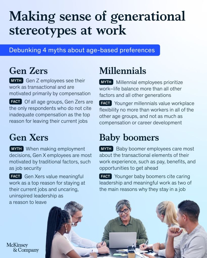 On this episode of the McKinsey Talks Talent podcast, McKinsey People & Organizational Performance talent experts Bryan Hancock and Bill Schaninger discuss new research on generational preferences at work: what’s myth, what matters, and how to manage the new multigenerational team: https://mck.co/3O2tnks